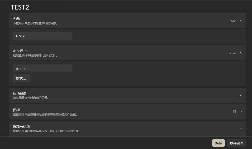 填写名称和命令行保存,命令行项填写上方正常连接或者快捷连接的命令皆可。在此处也可以进行powershell终端外观个性化配置。